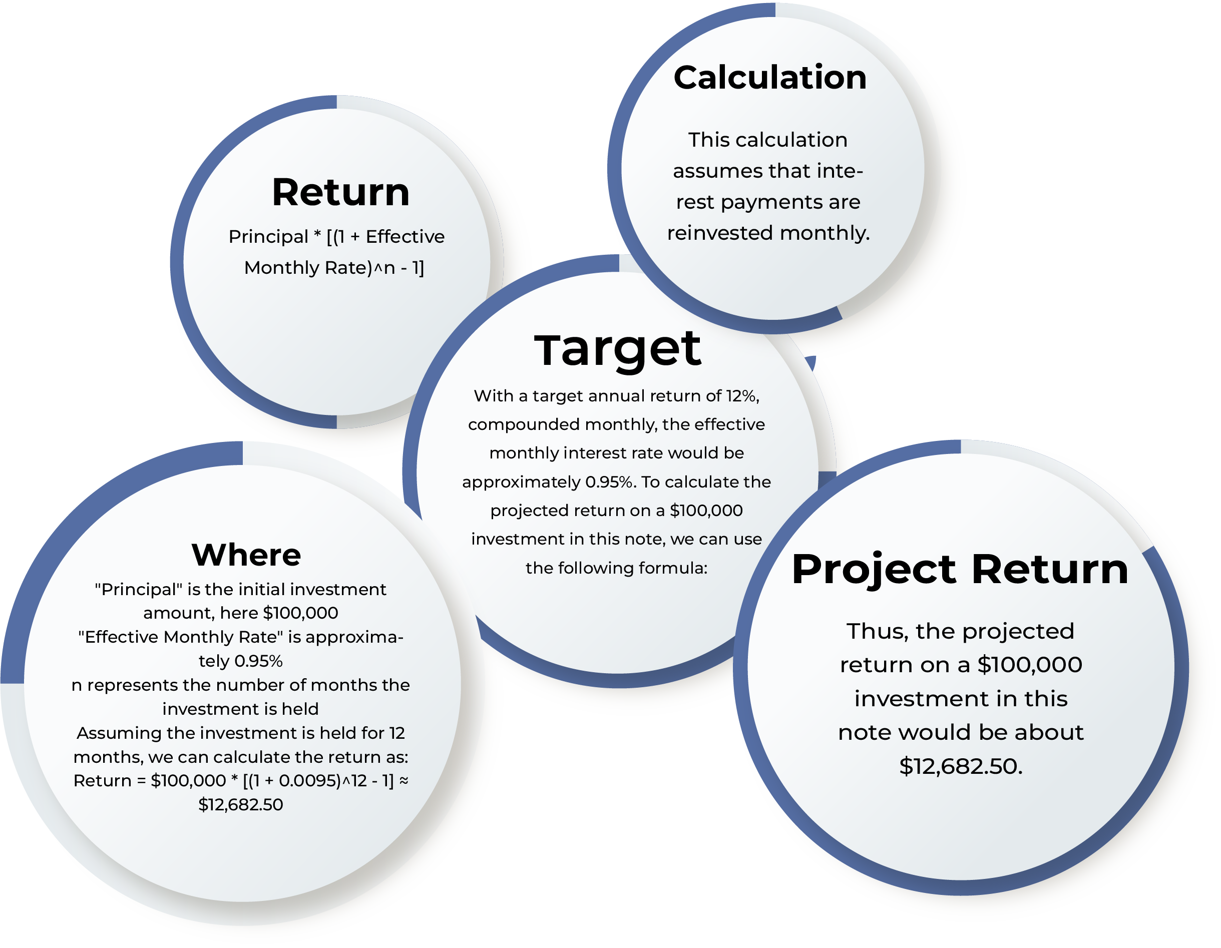 There is an annualized 12% quarterly payment that is paid to the investor. Investor’s original principal can be redeemed after 1 year or be rolled into another note at the investors option.