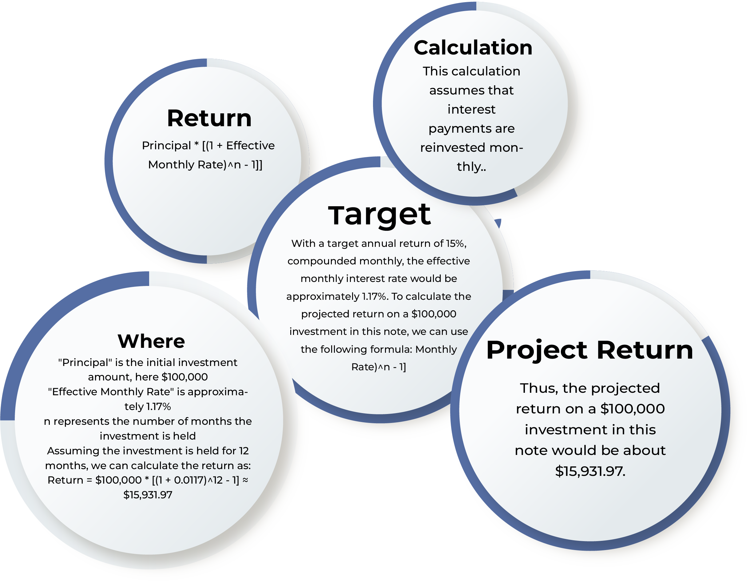 There is an annualized 15% quarterly payment that is paid to the investor. Investor’s original principal can be redeemed after 3 years or be rolled into another note at the investor’s option.