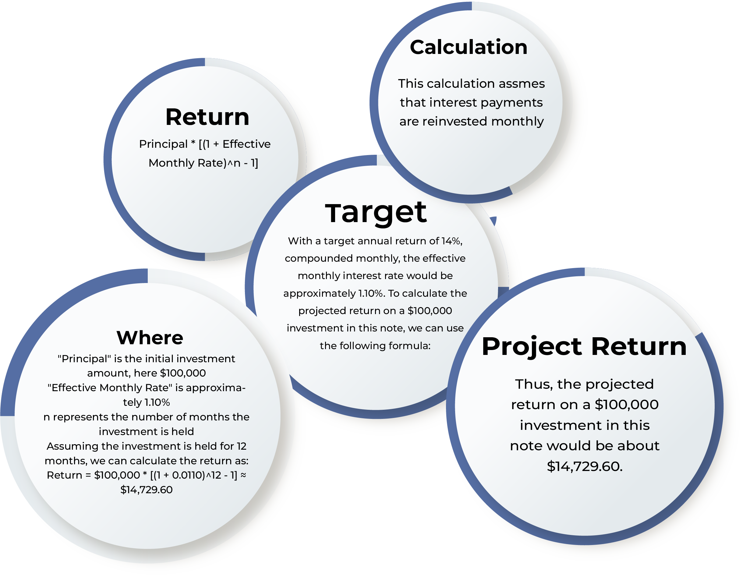 There is an annualized 14% quarterly payment that is paid to the investor. Investor’s original principal can be redeemed after 2 years or be rolled into another note at the investor’s option.